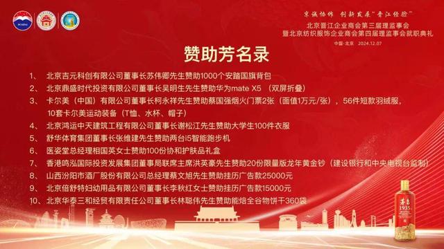 京晋企业谱华章,携手共进启新程。我相信,在北京、晋江两地党委政府的坚强领导下,在各位会员的共同努力支持下,在各界人士的关心帮助下,我们将赓续弘扬晋江人爱拼、敢拼、善拼之精神血脉,矢志不渝地推陈出新,续写“晋江经验”华章。北京晋江商会必如旭日东升,向着更为高远、更为卓越之境昂首迈进。与此同时,我们殷切期盼更多晋江乡贤翘楚融入我们的温馨家园。为晋京两地经济社会高质量发展奉献智慧和力量!