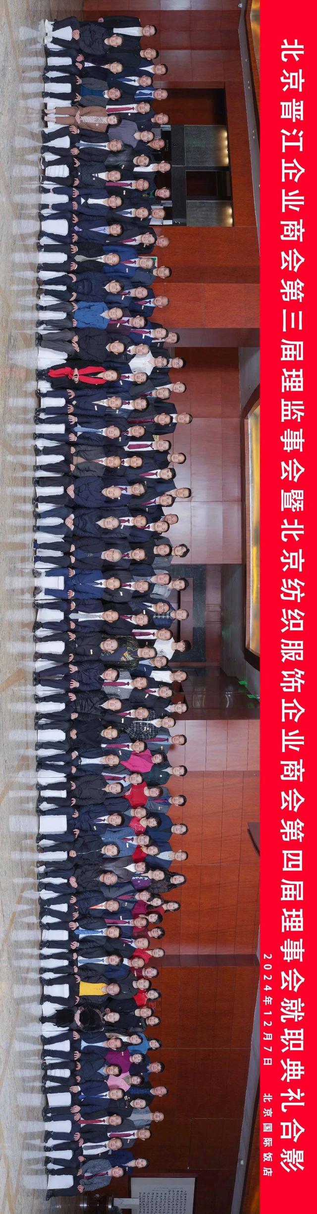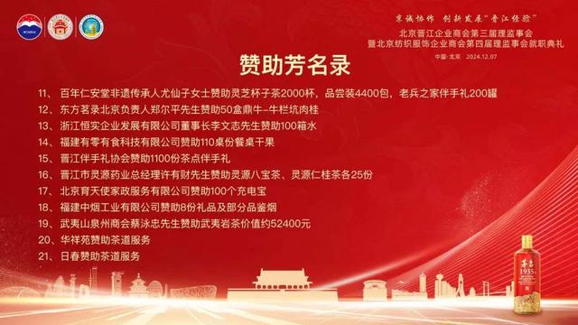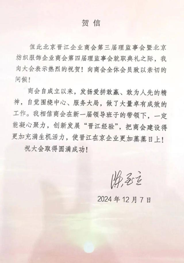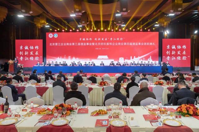 2024 年 12 月 7 日,北京晋江企业商会第三届理监事会暨北京纺织服饰企业商会第四届理监事会就职典礼于北京国际饭店隆重举行。此次庆典汇聚了各级领导与商界精英,共同见证商会发展的重要时刻。第八届全国人大常委会副委员长、党组副书记、第十四届中央政治局候补委员王汉斌,第十一届全国人大常委会副委员长、全国妇联原主席陈至立分别致信祝贺!出席盛会的嘉宾有:第十二届全国政协副主席、农工党中央原常务副主席刘晓峰,第十四届全国人大常委会委员、宪法和法律委员会副主任委员,中国法学会党组书记王洪祥,中国银监会原主席刘明康,全国人大常委会委员、华侨委副主任委员、致公党中央专职副主席曹鸿鸣,全国人大常委会原委员、全国人大社会建设委员会原副主任委员陈斯喜,中央宣传部原秘书长官景辉,原国务院侨务办公室副主任、中国华文教育基金会理事长任启亮,民政部原副部长、中国福利会原副主席顾朝曦,国家审计署原党组成员、中央经济责任审计办主任张通,国家统计局原局长邱晓华,中国文联原党组副书记、副主席覃志刚,国务院国资委原监事会主席、中国电力设备管理协会会长刘顺达,蔡英挺上将夫人于筠,全国工商联原专职副主席孙晓华,全国工商联原专职副主席庄聪生,中央民族大学原校长郭广生,中国轻工业联合会副会长、中国皮革协会理事长、消费日报社党总支书记李玉中,中关村军民融合信息装备产业促进会发展战略与科学技术委员会主席高东广将军,中国社区发展协会会长陈越良,中国国家博物馆党委书记杨帆,全国人大常委会华侨委员会正司长级干部朱守道,国家烟草局专卖监管司原司长蔡建文,中央统战部宣传办原主任高飞,中央机关原局级干部王建国,最高人民法院二级巡视员陈国华,中国交通报社原党委书记、董事长蔡玉贺,中国新闻社副社长陈建辉,北京京企中轴线保护公益基金会副理事长兼秘书长、北京市委宣传部原副部长梅松,北京市司法局原局长于泓源,北京市工商联党组成员、副主席李振坤,郑州市政府副市长胡军,钓鱼台宾馆管理局原副局长庄志哲,发改委能源司原副司长丁志敏,河南水利厅原副厅长梁再培,北京航空北京基地总经理罗军,北京大兴国际机场原总经理姚亚波,北京大学第一医院原院长刘新民,中国政法大学纪检监察学院副院长施鹏鹏,最高院高级法官洪清沪,北京市工商联处长戴维,东城区委统战部副部长、区工商联党组书记易月明,河南省新乡市平原示范区管委会主任岳永鹏,中国银行东城支行行长祁煜,贵州茅台酱香酒营销有限公司副总经理杨秀权,泉州市委原常委,一级巡视员,泉州民营经济研究院党委书记、理事会执行理事长刘文儒,晋江市人民政府市长王明元,晋江市人大常委会副主任王清龙,晋江市政协副主席张汉杰,泉州市工商联副主席李晓光,福建省政府驻京办联络处处长夏碧,厦门驻京办副主任郑永泓,泉州市驻京办联络处主任吴炳煌,三明驻京联络处主任黄兰春,龙岩驻京联络处主任李祥才,泉州泉商发展促进会党支部书记、常务副会长,原泉州市外事侨务办主任李卫平,泉州市政府办党委原书记苏文雅,晋江市委原常委、晋江市原常务副市长、泉州民营经济研究院理事会秘书长李自力,晋江市委原常委、统战部部长,晋江晋商发展促进会会长洪学谋,晋江市磁灶镇党委书记蔡文卿,晋江市深沪镇党委书记孙晋展,晋江市陈埭镇人民政府镇长许著赟,晋江市委统战部副部长、工商联党组书记、常务副主席陈贻得,晋江市新塘街道党工委书记庄晓芳,晋江市政府办主任张清常,晋江市政协秘书长刘向阳,晋江市人大常委会环境与城镇建设委员会主任朱文育,中国皮革和制鞋工业研究院晋江院院长王文琪,安海镇人大主席颜国升,晋江市政府驻京负责人李宝泉,晋江驻榕办负责人蔡长坚,晋江市文旅局局长蔡惠琼,晋江市退役军人事务局局长陈金尚,晋江产业集团董事长丁永贵,晋江市体城总经理陈紫华,晋江基层党组织吴金程书记、吴顺金书记,北京市丰台区新村街道党群服务中心主任王强,北京市异地商会第一联合党委副书记李修亮,商业第二联合党委副书记赵旭升。出席的商会会长还有:北京晋江企业商会荣誉会长、豪山集团董事长苏国川,北京晋江企业商会名誉会长、北京福建企业总商会会长、鑫桥联合融资租赁有限公司总裁施锦珊,北京晋江企业商会名誉会长、江苏晋江商会创会会长、友成集团董事长庄克服,北京晋江企业商会名誉会长吴华强、吴金针、吴清波、张华国、黄金朝,北京晋江企业商会名誉会长、泉州市工商联总商会副会长、豪信汽车集团总裁曾国信,重庆泉州商会会长吴碧水,山东泉州商会会长周荣来,武夷山泉州商会会长蔡咏忠,世界晋江青年联谊会会长周士渊,青阳商会会长蔡荣华,梅岭商会会长陈维进,西园商会会长王力量,罗山商会会长陈天奖,灵源商会会长吴明强,池店商会会长唐炎坤,内坑商会会长王文品,永和商会会长许远南,广东晋江商会会长庄小铭,昆明市福建晋江商会会长蔡伟毅,福州晋江商会会长谢嘉庆,天津晋江商会会长唐文辉,江苏晋江商会会长洪飞雄,山西晋江商会会长赖梓恩,贵州晋江商会会长吴侨军,广州晋江商会会长洪我良,安徽晋江商会会长施义车,浙江晋江商会会长陈新生,南宁晋江商会会长李天祝,义乌晋江商会会长张水顺。出席的在京