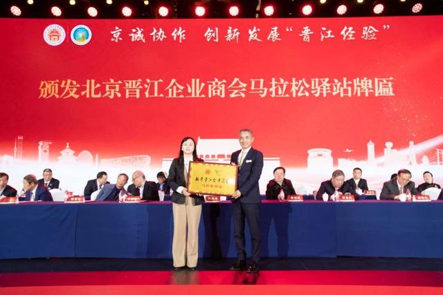 2024特步晋江马拉松赛在晋江顺利举办,来自13个国家的2万名跑友,燃情奔跑最美赛道,领略晋江魅力风光。今天,北京晋江企业商会积极传递马拉松拼搏向前精神,在京成立了马拉松驿站,致力推动和服务广大朋友开展跑步运动,大力倡导绿色健康的生活方式,为文体事业再添一抹光彩。现场,举行北京晋江企业商会马拉松驿站授牌仪式, 晋江市文体旅局局长蔡惠琼为驿站代表苏伟卿授牌。