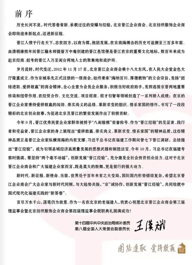 雄关漫道、任重道远,奋战正酣、踌躇满志。我们坚信,在北京、晋江两地各级领导的关心和各职能部门的指引下,北京晋江企业商会、北京纺织服饰企业商会的明天一定会更加美好!广大在京晋江商人定将和衷共济、踏浪奋进,以出江入海的气魄,爱拼敢赢的精神,传承弘扬、创新发展“晋江经验”,奏响最响亮的新时代乐章!
