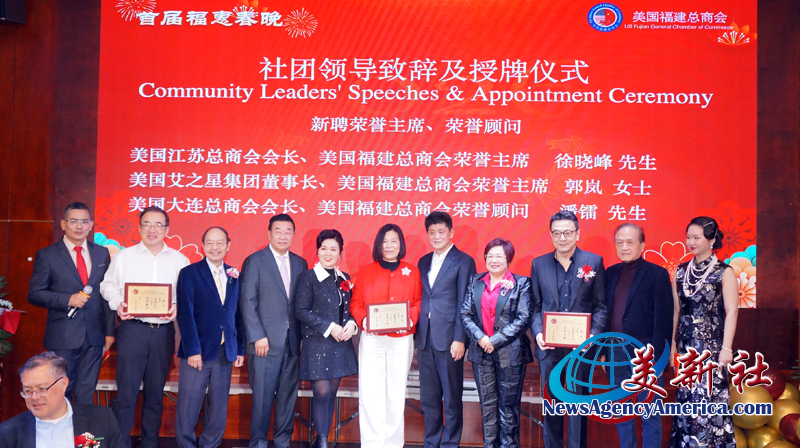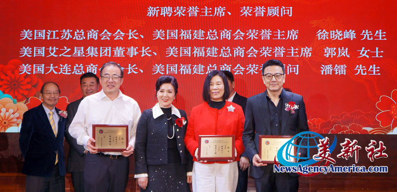 當晚,美國福建總商會也新聘兩位榮譽主席:美國江蘇總商會會長 徐曉峰、美國艾之星集團董事長 郭岚女士,和一位榮譽顧問:美國大連總商會會長 潘鐳;由楊麗桢會長頒發聘書。