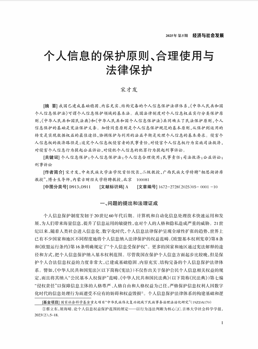 宋才发教授发表论文《个人信息的保护原则、合理使用与法律保护》