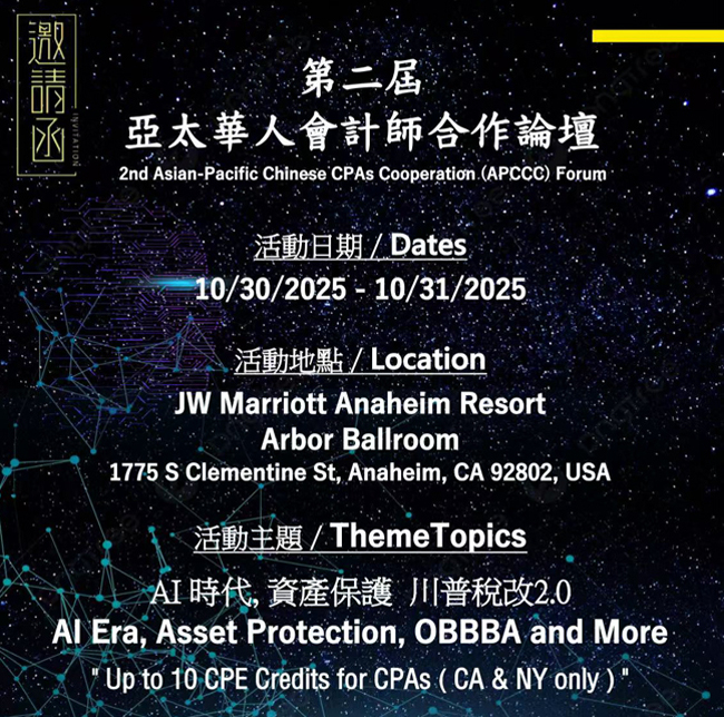 亞太華人會計師合作論壇(APCCC) 由在美華人註冊會計師主導,是個融合專業、教育與公益使命的國際交流平台,致力於推動跨區域、跨協會的專業合作與知識共享,促進全球華人會計與財稅專業社群的遠發展與國際連結。