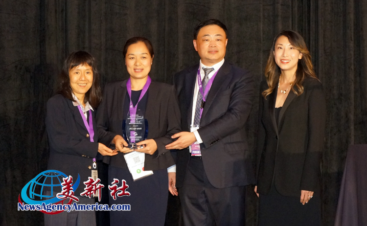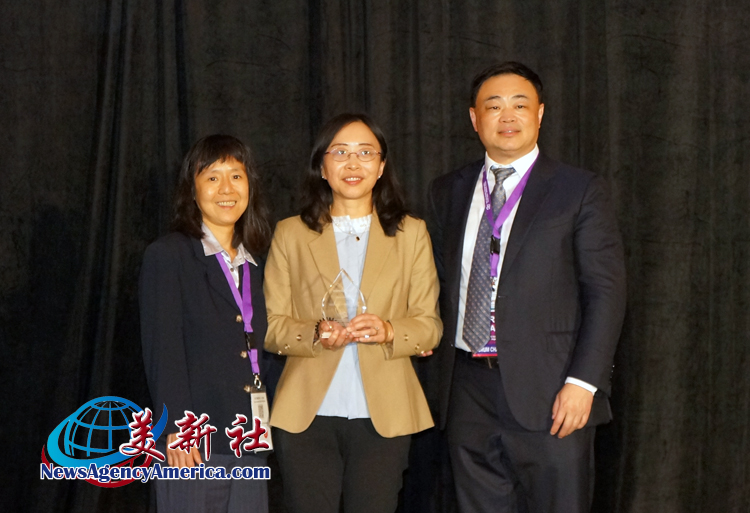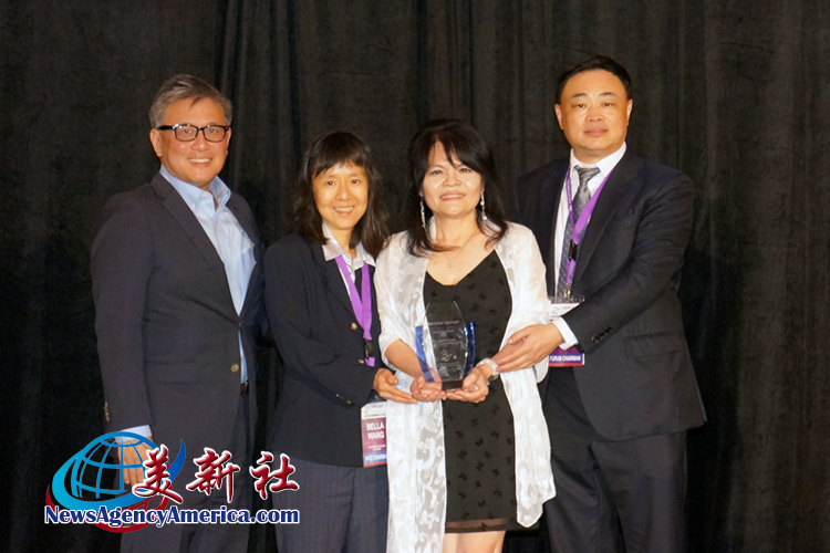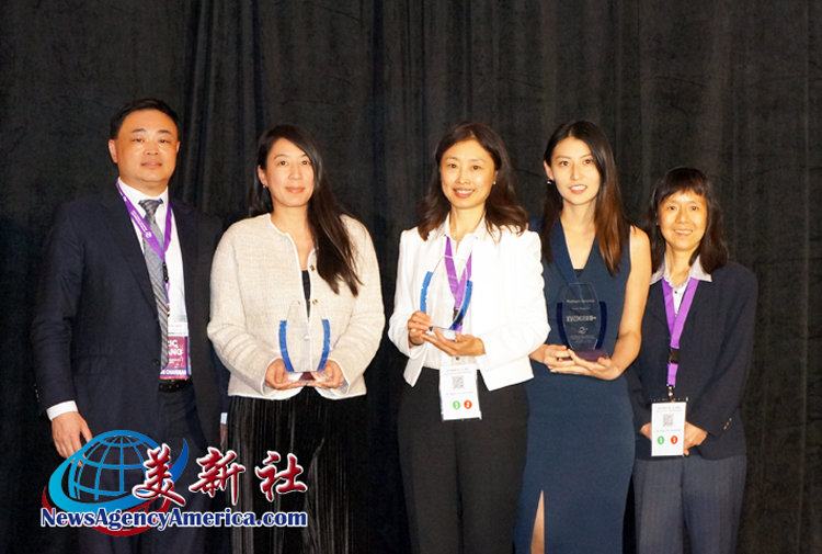 『亞太華人社區傑出青年女性會計師獎』獲獎者:樂艷林會計師(Elaine Yanlin Yue CPA,左2)領受獎杯並發表獲獎感言