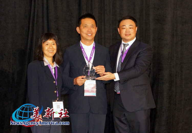 組委會主席 張青會計師(Eric Zhang,右1)和洛杉磯亞太會計師協會會長 Bella Wang(左1),向黃金贊助商:adesso 總裁 Allen Ku(中)頒發感謝獎杯