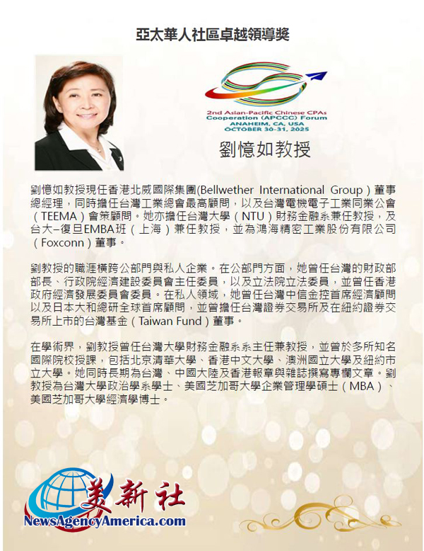 劉憶如教授,榮獲『亞太華人社區卓越領導獎』