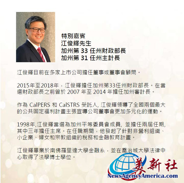 江俊輝(John Chiang)在2007年至2014年,擔任加州第31任審計長,之後在2015年至2018年,擔任加州第33任州財政部長,還曾參選加州州長。
