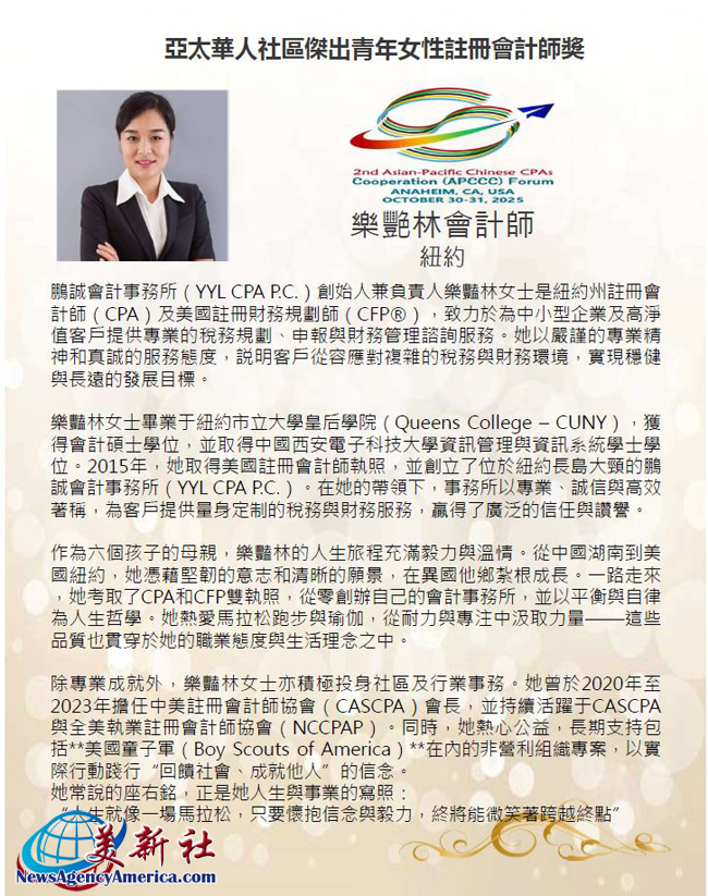 樂艷林會計師(Elaine Yanlin Yue CPA)從中國湖南到美國紐約,她憑藉堅韌的意志和清晰的願景,在異國他鄉紮根成。作為一名有6個子女的母親,她做到了兼顧事業與家庭。她的座右銘是:“人生就像場馬拉松,只要懷抱信念與毅力,終將能微笑著跨越終點”。