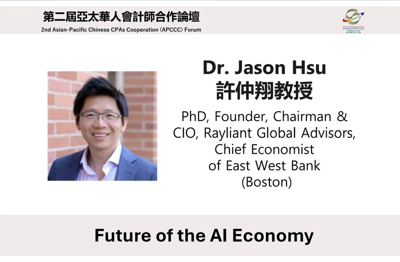 許仲翔博士的主旨演講題目是《AI 經濟的未來》,他指出人工智能(AI)勢不可擋地將帶來龐大的財富和生產力的創造,也會帶來許多的失業問題,從而引發“大政府”的介入,來幫助這些失業人口的再就業。因此,美國製造業外移所造成的“大政府”趨勢將繼續惡化,同時政府財政也將惡化。這對會計師、理財師等財經行業專業人士來說是一種“危機”。
