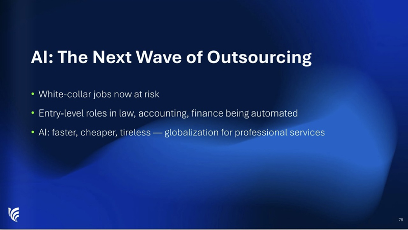 許仲翔博士也指出,人工智能(AI)將造成新一波的“外包(Outsourcing)”,律所、會計師事務所、理財機構的入門級職位都將“自動化”,造成此類專業服務的“全球化”演變。因此,能夠識別機遇,擁抱 AI 的企業將因此獲益。