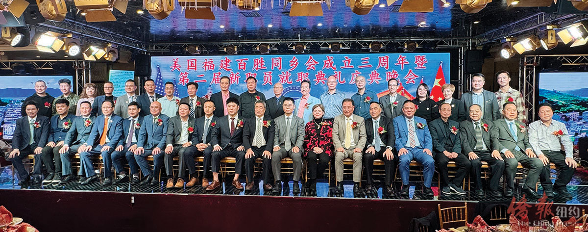 【侨报纽约讯】 美国福建百胜同乡会成立三周年暨第二届新职员就职典礼日前在法拉盛君豪大酒楼举行,近五百多位嘉宾出席典礼。总领馆向裕韬领事和荣顶领事也应邀见证印绶交接仪式,会长池茂斌从创会主席孙清开手中交接会玺。晚会由项静文主持。美国飞虎队陈纳德将军孙女、陈纳德将军基金会董事长Nell Calloway也应邀出席活动并致辞。