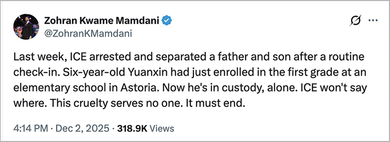 【侨报纽约讯】候任市长曼达尼2日在社交媒体上首次提及一名6岁的华童于上周三(11月26日)被ICE关押,并与其父亲分离。父子二人26日早上在前往曼哈顿下城联邦广场26号的移民局大楼报到时被逮捕。至2日为止,ICE的查询系统可确认该男童的父亲“X飞”处在关押状态,但男童下落不明且姓名并未出现ICE的数据库中。国土安全部发言人承认两人被分开,但未透露孩子所在地,只表示其父亲在遣返过程中“拒绝登机、行为激烈”,危及孩子安全,因此被分开。
