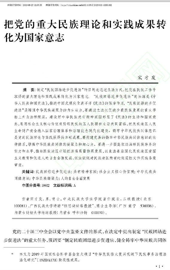 宋才发教授发表论文:《把党的重大民族理论和实践成果转化为国家意志》(一)
