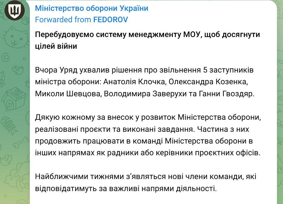 1月22日,乌克兰国防部长费多罗夫在社交媒体发文,宣布乌国防部5名副部长职务被解除。