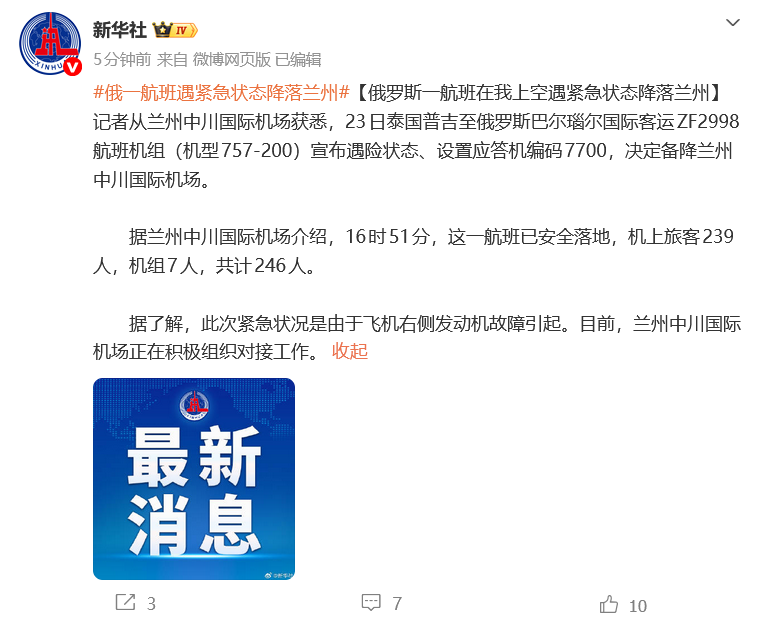 据兰州中川国际机场介绍,16时51分,这一航班已安全落地,机上旅客239人,机组7人,共计246人。
