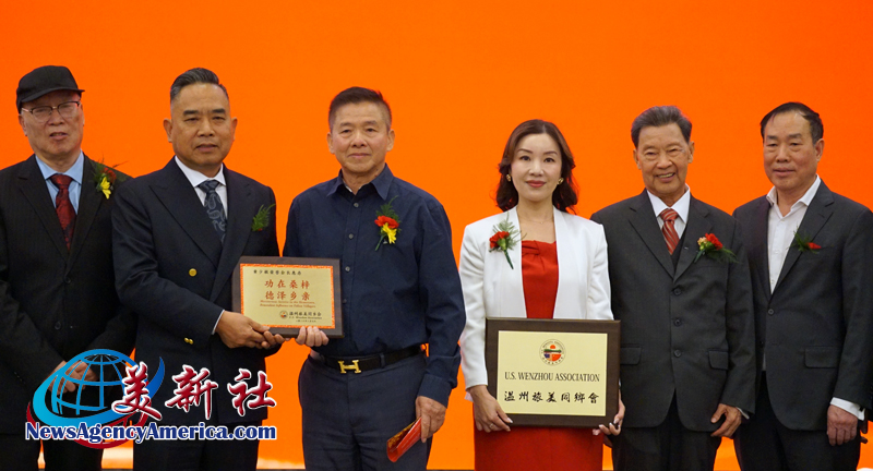 溫州旅美同鄉會董事長及榮譽會長 潘松林(左3)向第十二屆會長黃少敏(左2)頒發感謝獎牌