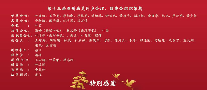 感恩:溫州旅美同鄉會成立了三十年,美南華總至今二十一年。溫州旅美同鄉會的榮譽會長,如:王儉美會長、李社潮會長,也是美南華總的榮譽會長。溫州旅美同鄉會的其他主要干部也都是美南華總的中堅力量。