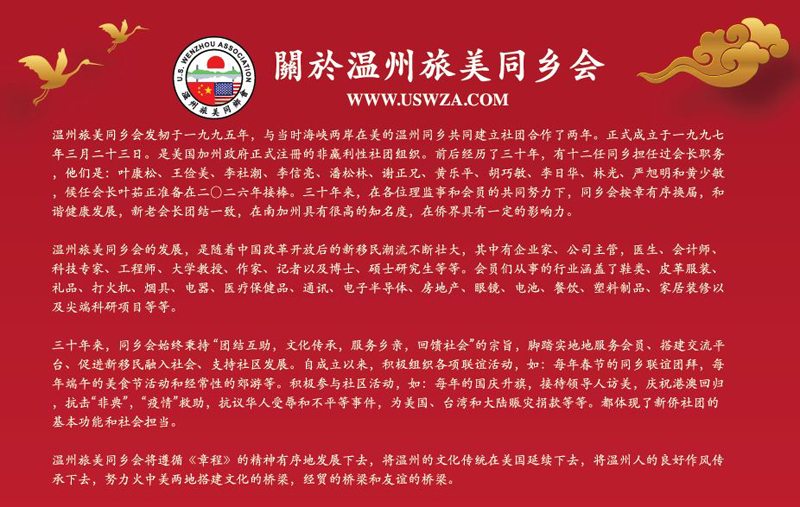 與此同時,我們也一直在思考,在新的時代背景下,溫州旅美同鄉會應當如何進一步發揮平台作用,如何讓‘團結互助’不只停留在理念層面,而是真正落實到社區建設、資源整合和代際傳承中去。圍繞這一方向,我們也進行了一些探索,希望為同鄉會未來更長遠的發展積累經驗、拓展空間。