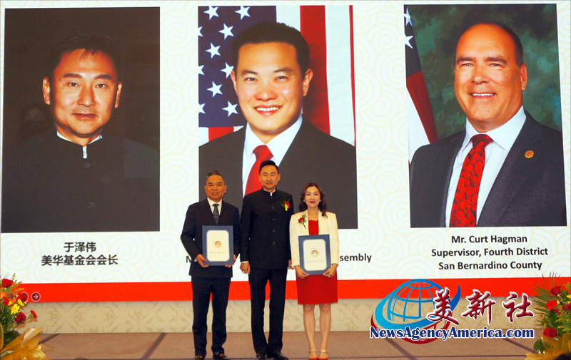 美華基金會會長于澤偉頒發美華基金會賀喜匾額德同時,也代表加州眾議員陳立德(Phillip Chen)和聖伯納迪諾郡第四區郡長海格曼(Curt Hagman)頒發了賀狀。