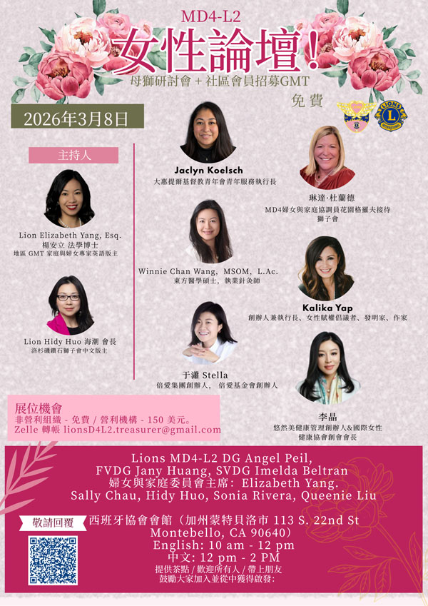【洛杉磯訊】在3月8日國際婦女節這個充滿意義的日子,國際獅子會洛杉磯 Lions MD4-L2 舉辦 “Women: Lionesses Unite Symposium and Community Membership Drive” 婦女論壇暨社區會員推廣活動,吸引近100位婦女領袖、