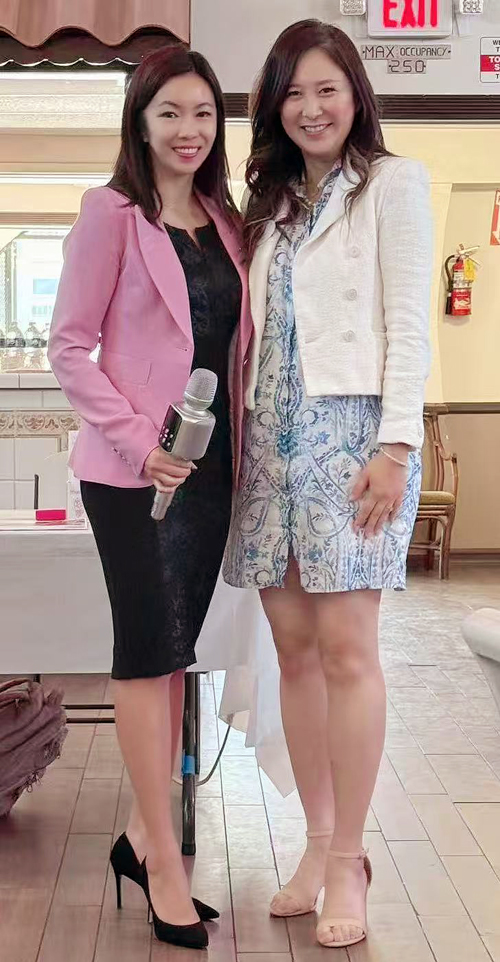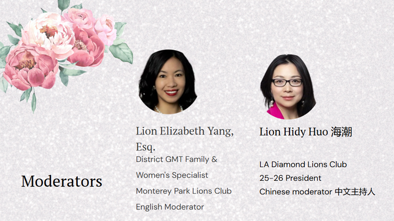 兩位主持人:Lion Elizabeth Yang(蒙特利公園市長、法學博士 楊安立)、Lion Hidy Huo(LA 鑽石獅子會會長 海潮)