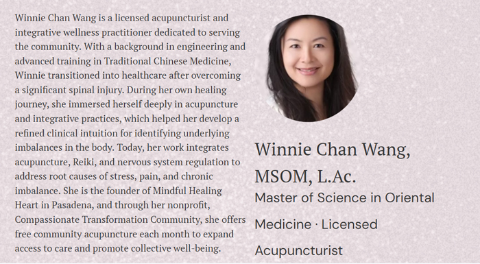 Winnie Chan Wang – Licensed Acupuncturist and Practitioner of Oriental Medicine, MIT engineer