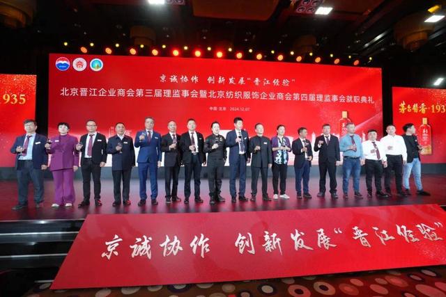 2024 年 12 月 7 日,北京晋江企业商会第三届理监事会暨北京纺织服饰企业商会第四届理监事会就职典礼于北京国际饭店隆重举行。此次庆典汇聚了各级领导与商界精英,共同见证商会发展的重要时刻。第八届全国人大常委会副委员长、党组副书记、第十四届中央政治局候补委员王汉斌,第十一届全国人大常委会副委员长、全国妇联原主席陈至立分别致信祝贺!出席盛会的嘉宾有:第十二届全国政协副主席、农工党中央原常务副主席刘晓峰,第十四届全国人大常委会委员、宪法和法律委员会副主任委员,中国法学会党组书记王洪祥,中国银监会原主席刘明康,全国人大常委会委员、华侨委副主任委员、致公党中央专职副主席曹鸿鸣,全国人大常委会原委员、全国人大社会建设委员会原副主任委员陈斯喜,中央宣传部原秘书长官景辉,原国务院侨务办公室副主任、中国华文教育基金会理事长任启亮,民政部原副部长、中国福利会原副主席顾朝曦,国家审计署原党组成员、中央经济责任审计办主任张通,国家统计局原局长邱晓华,中国文联原党组副书记、副主席覃志刚,国务院国资委原监事会主席、中国电力设备管理协会会长刘顺达,蔡英挺上将夫人于筠,全国工商联原专职副主席孙晓华,全国工商联原专职副主席庄聪生,中央民族大学原校长郭广生,中国轻工业联合会副会长、中国皮革协会理事长、消费日报社党总支书记李玉中,中关村军民融合信息装备产业促进会发展战略与科学技术委员会主席高东广将军,中国社区发展协会会长陈越良,中国国家博物馆党委书记杨帆,全国人大常委会华侨委员会正司长级干部朱守道,国家烟草局专卖监管司原司长蔡建文,中央统战部宣传办原主任高飞,中央机关原局级干部王建国,最高人民法院二级巡视员陈国华,中国交通报社原党委书记、董事长蔡玉贺,中国新闻社副社长陈建辉,北京京企中轴线保护公益基金会副理事长兼秘书长、北京市委宣传部原副部长梅松,北京市司法局原局长于泓源,北京市工商联党组成员、副主席李振坤,郑州市政府副市长胡军,钓鱼台宾馆管理局原副局长庄志哲,发改委能源司原副司长丁志敏,河南水利厅原副厅长梁再培,北京航空北京基地总经理罗军,北京大兴国际机场原总经理姚亚波,北京大学第一医院原院长刘新民,中国政法大学纪检监察学院副院长施鹏鹏,最高院高级法官洪清沪,北京市工商联处长戴维,东城区委统战部副部长、区工商联党组书记易月明,河南省新乡市平原示范区管委会主任岳永鹏,中国银行东城支行行长祁煜,贵州茅台酱香酒营销有限公司副总经理杨秀权,泉州市委原常委,一级巡视员,泉州民营经济研究院党委书记、理事会执行理事长刘文儒,晋江市人民政府市长王明元,晋江市人大常委会副主任王清龙,晋江市政协副主席张汉杰,泉州市工商联副主席李晓光,福建省政府驻京办联络处处长夏碧,厦门驻京办副主任郑永泓,泉州市驻京办联络处主任吴炳煌,三明驻京联络处主任黄兰春,龙岩驻京联络处主任李祥才,泉州泉商发展促进会党支部书记、常务副会长,原泉州市外事侨务办主任李卫平,泉州市政府办党委原书记苏文雅,晋江市委原常委、晋江市原常务副市长、泉州民营经济研究院理事会秘书长李自力,晋江市委原常委、统战部部长,晋江晋商发展促进会会长洪学谋,晋江市磁灶镇党委书记蔡文卿,晋江市深沪镇党委书记孙晋展,晋江市陈埭镇人民政府镇长许著赟,晋江市委统战部副部长、工商联党组书记、常务副主席陈贻得,晋江市新塘街道党工委书记庄晓芳,晋江市政府办主任张清常,晋江市政协秘书长刘向阳,晋江市人大常委会环境与城镇建设委员会主任朱文育,中国皮革和制鞋工业研究院晋江院院长王文琪,安海镇人大主席颜国升,晋江市政府驻京负责人李宝泉,晋江驻榕办负责人蔡长坚,晋江市文旅局局长蔡惠琼,晋江市退役军人事务局局长陈金尚,晋江产业集团董事长丁永贵,晋江市体城总经理陈紫华,晋江基层党组织吴金程书记、吴顺金书记,北京市丰台区新村街道党群服务中心主任王强,北京市异地商会第一联合党委副书记李修亮,商业第二联合党委副书记赵旭升。出席的商会会长还有:北京晋江企业商会荣誉会长、豪山集团董事长苏国川,北京晋江企业商会名誉会长、北京福建企业总商会会长、鑫桥联合融资租赁有限公司总裁施锦珊,北京晋江企业商会名誉会长、江苏晋江商会创会会长、友成集团董事长庄克服,北京晋江企业商会名誉会长吴华强、吴金针、吴清波、张华国、黄金朝,北京晋江企业商会名誉会长、泉州市工商联总商会副会长、豪信汽车集团总裁曾国信,重庆泉州商会会长吴碧水,山东泉州商会会长周荣来,武夷山泉州商会会长蔡咏忠,世界晋江青年联谊会会长周士渊,青阳商会会长蔡荣华,梅岭商会会长陈维进,西园商会会长王力量,罗山商会会长陈天奖,灵源商会会长吴明强,池店商会会长唐炎坤,内坑商会会长王文品,永和商会会长许远南,广东晋江商会会长庄小铭,昆明市福建晋江商会会长蔡伟毅,福州晋江商会会长谢嘉庆,天津晋江商会会长唐文辉,江苏晋江商会会长洪飞雄,山西晋江商会会长赖梓恩,贵州晋江商会会长吴侨军,广州晋江商会会长洪我良,安徽晋江商会会长施义车,浙江晋江商会会长陈新生,南宁晋江商会会长李天祝,义乌晋江商会会长张水顺。出席的在京