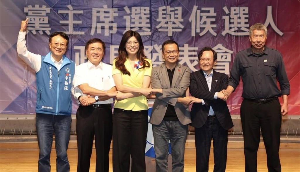 国民党主席选举候选人:卓伯源(左起)、郝龙斌、郑丽文、罗智强、蔡志弘及张亚中(图源:台湾“中央社”)