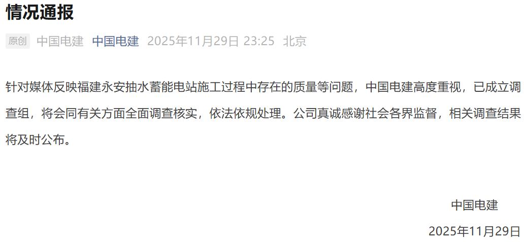 据微信公众号“中国电建”消息,11月29日晚,中国电建发布情况通报: