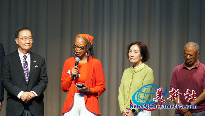 拉古納伍茲市長 Annie McCary 致詞祝賀(左起):加州參議員 Steven Choi、拉古納伍茲市長 Annie McCary、拉古納伍茲副市長 Pearl Lee 等